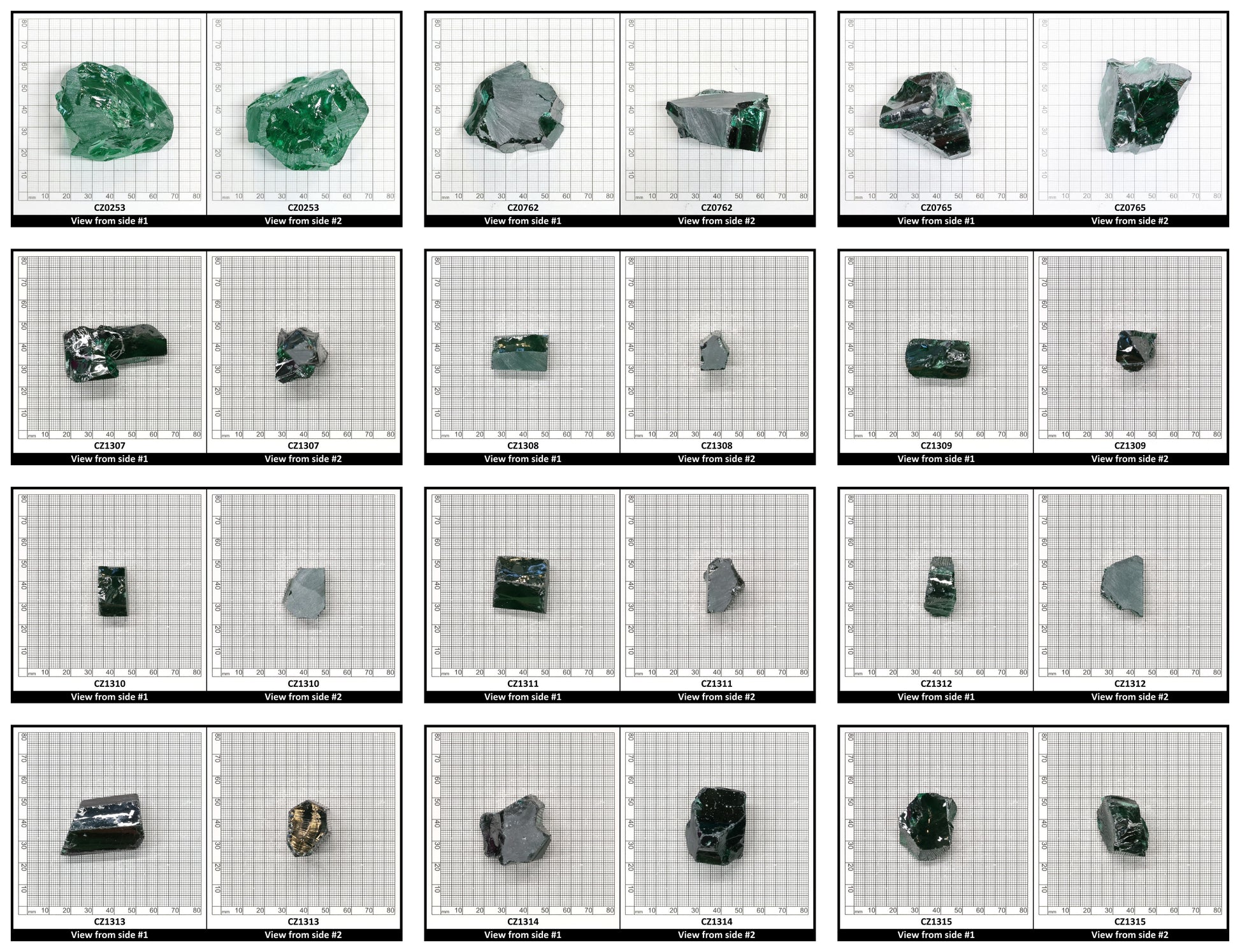 Various sizes of Emerald Cubic Zirconia rough for faceting and gemstone creation.