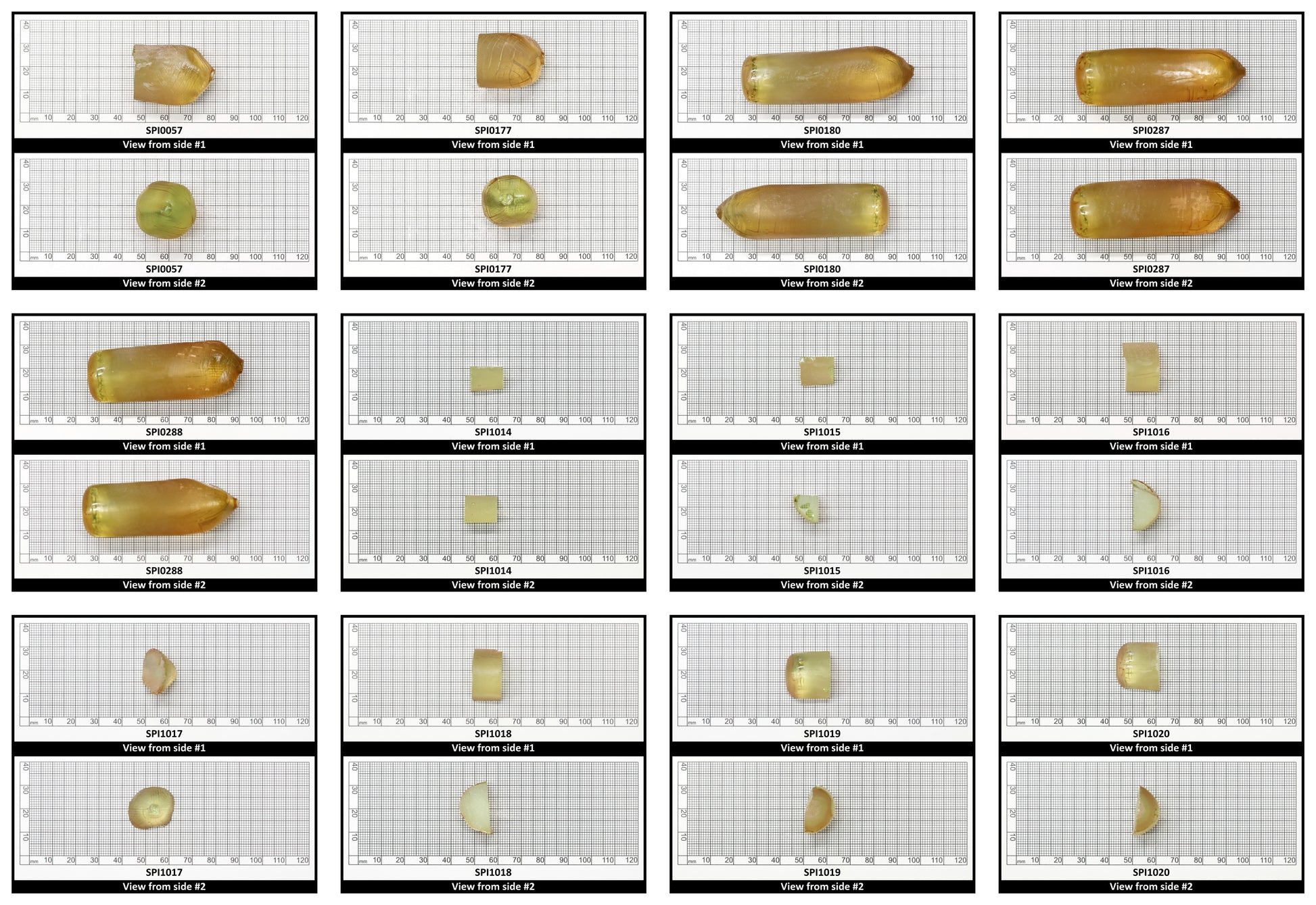 Various sizes of Greenish Yellow colored lab created spinel rough for faceting and gemstone creation.